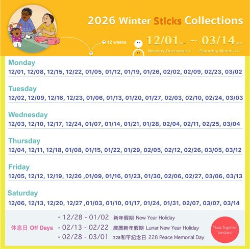 冬季星期六 [混齡班] 12 堂 | 適合0-5歲的孩子 | 一小二大陪同